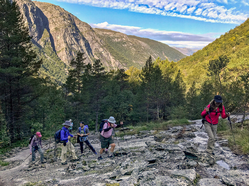 One of our more challenging hikes takes us up the Kinso River to three huge waterfalls: Tveitafossen, Nyastølfossen, and Nykkjesøyfossen. Even during a “dry” year and at the end of summer, Norwegian waterfalls still put on a show.