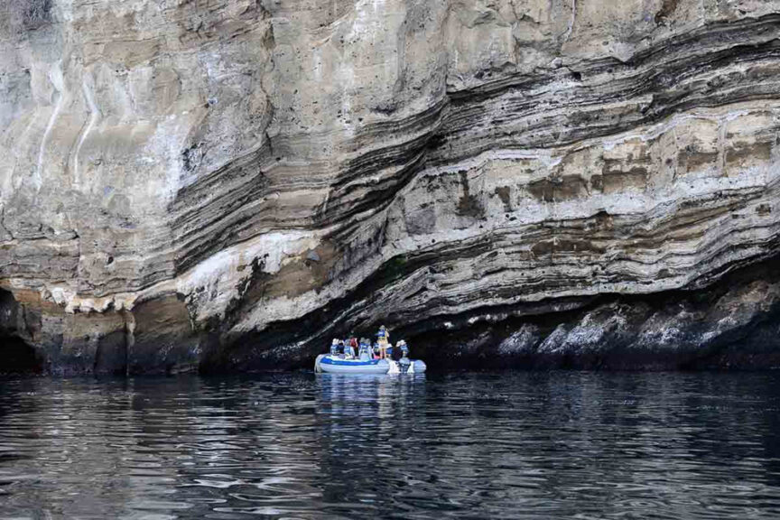 On some days, this activity was replaced by a coastal tour in the pangas, where we were able to see penguins and sea lions as well as examine the spectacular rock formations along the coast and appreciate the incredible layering in the rocks that resulted from multiple volcanic eruptions and lava flows. At the end of the afternoon walks on most days, we were treated to spectacular sunsets.