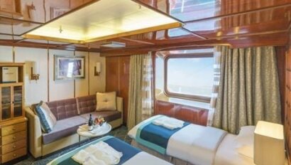 One of the most spacious and luxurious expedition vessels in operation, the Sea Spirit carries a maximum of 114 guests in all outside-facing suites with private bath facilities, two twin beds that can be reconfigured into one queen, sitting area with sofa bed, picture window or portholes, walk-in closet or wardrobe, personal safe, and small refrigerator. All cabins have TV/VCR and individually controlled thermostats. This outstanding expedition vessel offers two large lounges, fine dining, a hot tub, library, gym, and elevator access to all passenger levels. A fleet of sturdy inflatable landing crafts is used for shore excursions.