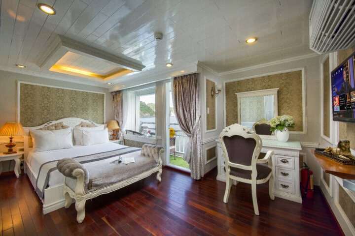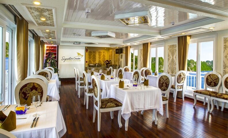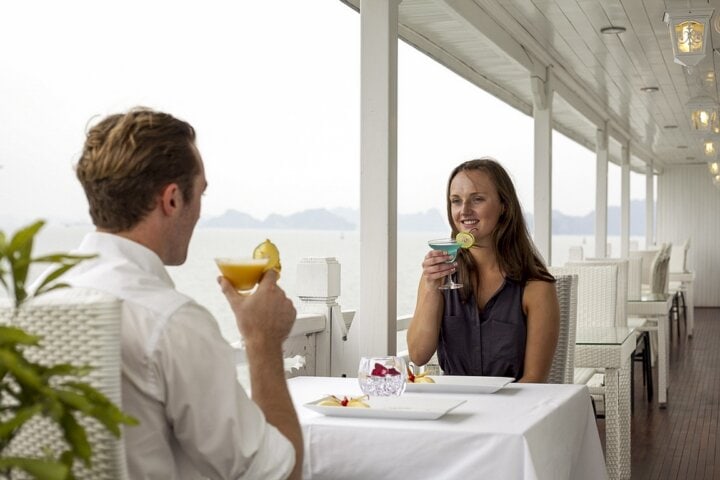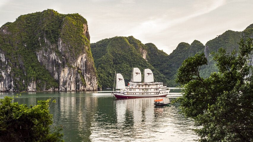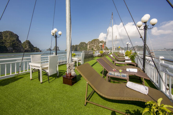 The Halong Bay Cruise is an elegant ship designed to make her way through the limestone islands and inlets of Halong Bay. This 40-passenger vessel has a 2 to 1 passenger to crew ratio, 12 spacious cabins, and three decks. Cabins feature hand-crafted wooden desks and wardrobes, remote-controlled AC, and private Jacuzzi bathtubs. Relax on one of the ship's sun terraces—the Rooftop Sun Terrace is a guest favorite, or have a drink at the bar beneath the sway of the ship's sails. The restaurant serves fresh seafood, Vietnamese, and international cuisine with lively Asian flavors.