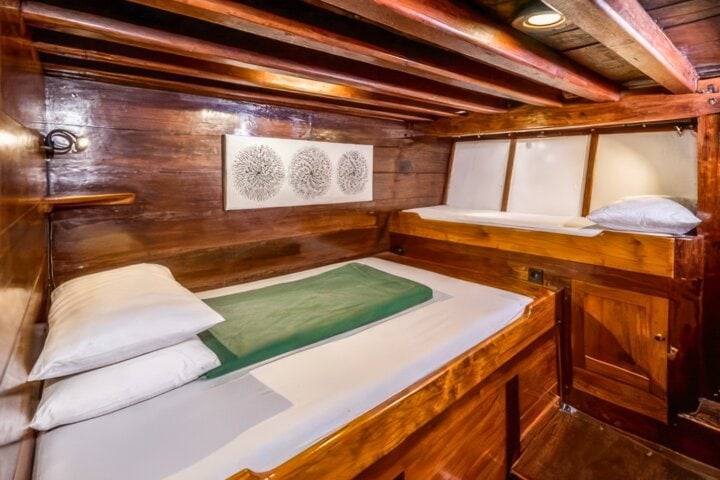 There are two cabins located on the main deck, which are slightly smaller than the Lower Deck Cabins. Each cabin has a bunk with one double bed and one single bed, and built-in storage. There are also small non-opening windows to allow natural light in.