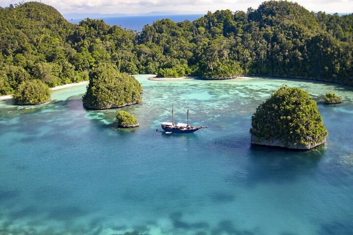Our vessel is a double-masted traditional Indonesian sailboat that offers the unique opportunity to explore the incredibly remote, unique, and mystical Raja Ampat archipelago. The boat was built in Sulawesi in 2000 out of Indonesian hardwoods and is 100 feet long with a 21-foot beam. While not luxurious, she is comfortable, well maintained. There are six double cabins with en suite bathrooms, individually controlled air-conditioning, and electricity 24 hours a day. The boat is very sturdy and stable, whether still or under motor. The boat's crew of seven is attentive, experienced, and helpful, and many have worked on the boat for years. Note: There are four cabins below deck, and two cabins on the main deck (where the dining room and common areas are located). Please note that the cabins below deck require descending steep stairs/ladders, and that the cabins above deck are slightly smaller.
