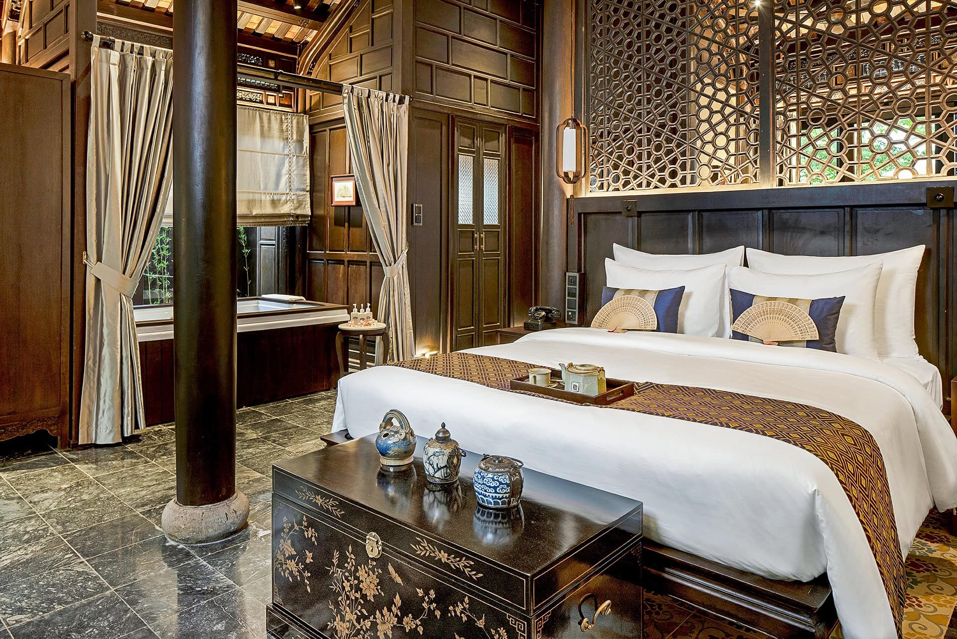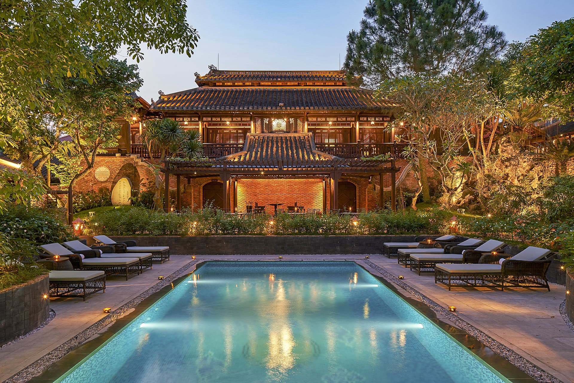 On the banks of the Perfume River, these five wooden houses are set in a landscaped garden around a year-round heated pool. Built according to strict Feng Shui principles, the homes are designed to bring in the elements of garden, pond, and yard. The restaurant, located in the main Garden House, features Asian and European flavors that are said to be reminiscent of ancient royal feasts. Enjoy a creative cocktail made with local fruits in the Lounge bar, or unwind with a massage at the spa.