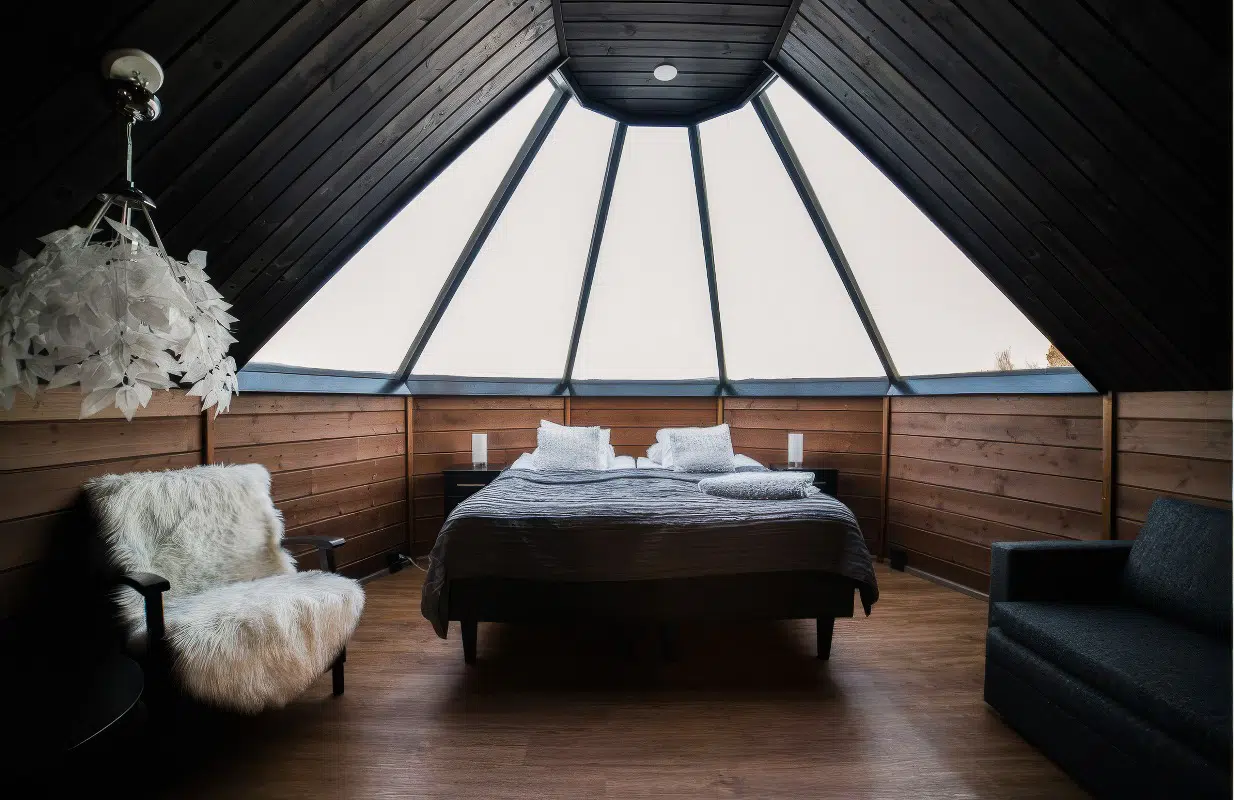 Situated right by Lake Inari with a superb location to view the northern lights, the Aurora Cabins by Holiday Village are the perfect place to immerse yourself in Lappish culture. Each cabin is cozy yet spacious, with a sitting area, private bathroom with shower, and the bed is under a clear roof, where you can gaze at the night sky and search for the shimmering northern lights.