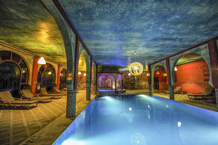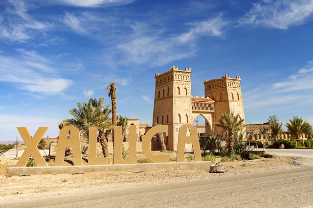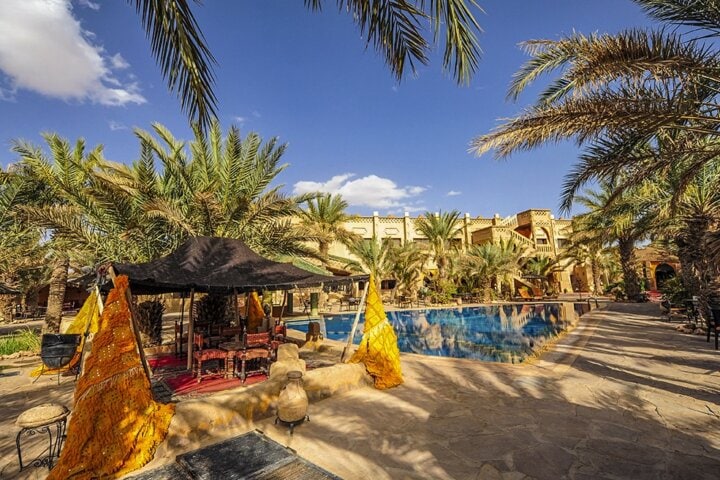 Surrounded by desert sands on the edge of the Moroccan Sahara, this newly built kasbah-style hotel is very atmospheric, with its numerous adobe courtyards and stylish guest rooms decorated to resemble nomads' tents. The main interior courtyard centers around a lovely swimming pool and bar shaded by palms. Breakfast and dinner are buffet style.