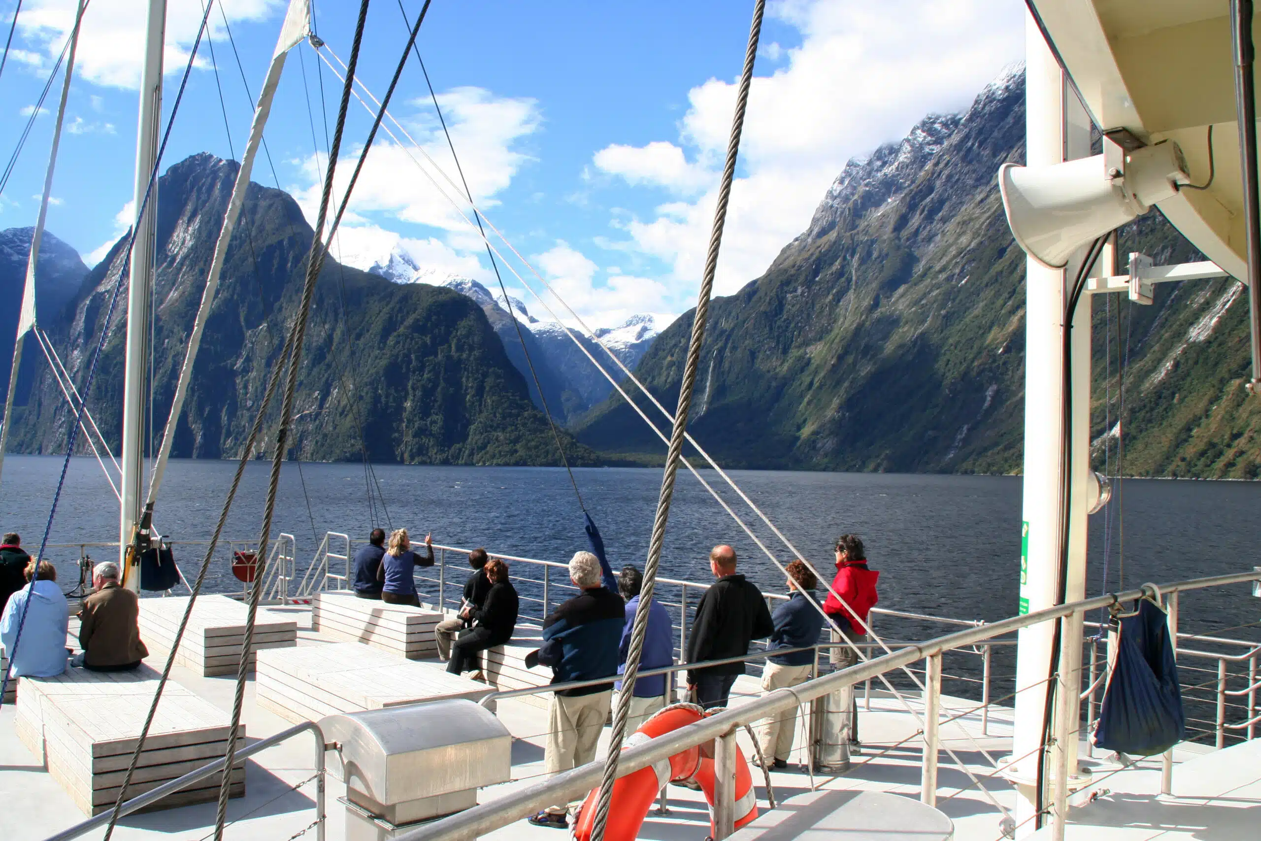 For our overnight cruise in spectacular Milford Sound, we have comfortable private cabins with en suite bathrooms on the 60-passenger Milford Mariner, a traditional-style motor vessel with staysail schooner-rigged sails. By choosing an overnight cruise rather than a day cruise, we get to explore the full length of this world-famous mountain fjord, experiencing its many moods as the light changes from day to night. Along the way, we keep an eye out for wildlife including penguins, dolphins, and seals, with options for exploring by small boat or by sit-on-top kayak with the onboard naturalists. The chef serves up delicious meals in the dining salon.