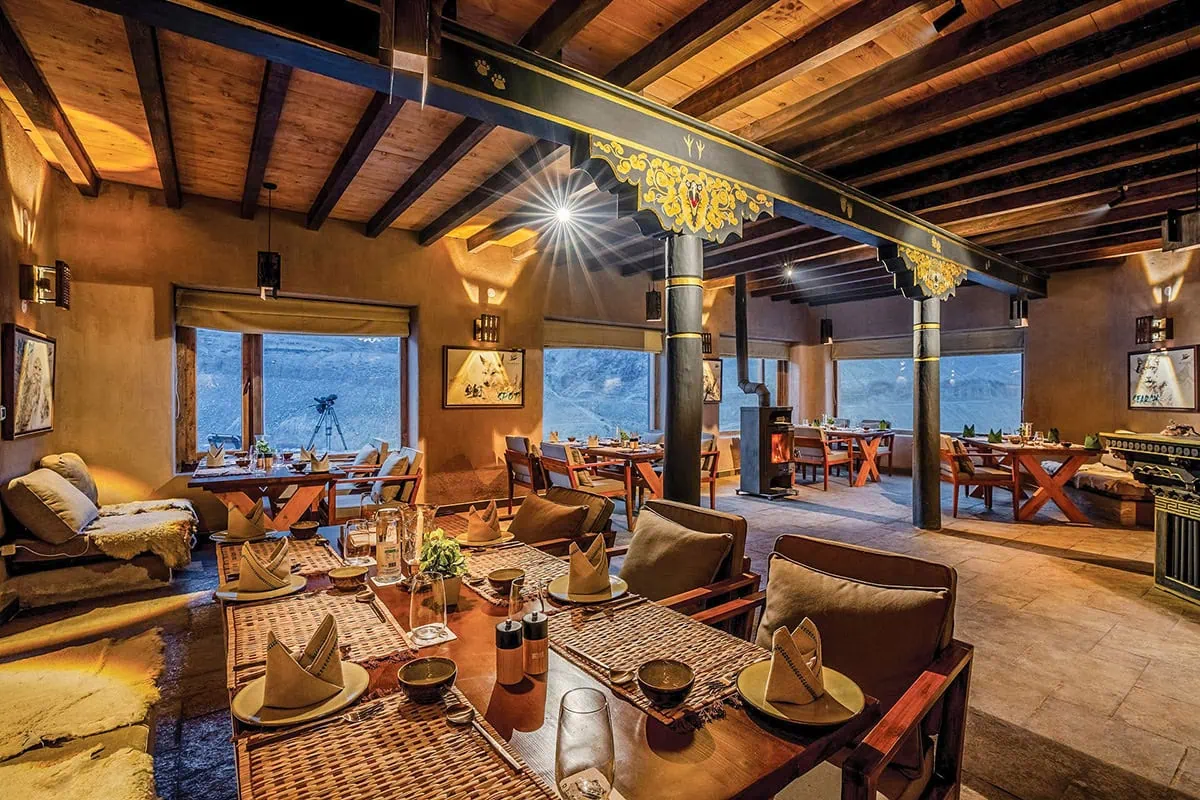Rumbak’s suites overlook a panorama of snow-capped mountains on the edge of Hemis National Park. Guest rooms are comfortable, with underfloor heating and double-glazed windows. Meals are served in the common dining and lounge area, heated using a traditional wooden stove, and their in-house bakery serves a variety of freshly baked goods.