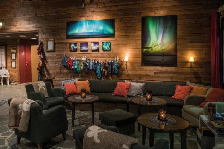Situated in a perfect location near activities like reindeer sleigh rides and snow-shoeing adventures, this cozy hotel has comfortable rooms with wood detailing, a relaxing sauna, and an open dining room with large windows and a fireplace. Be sure to enjoy some hot cocoa near the hotel's grand fireplace after a day in the snow.