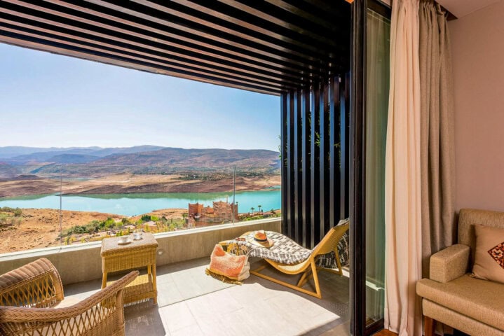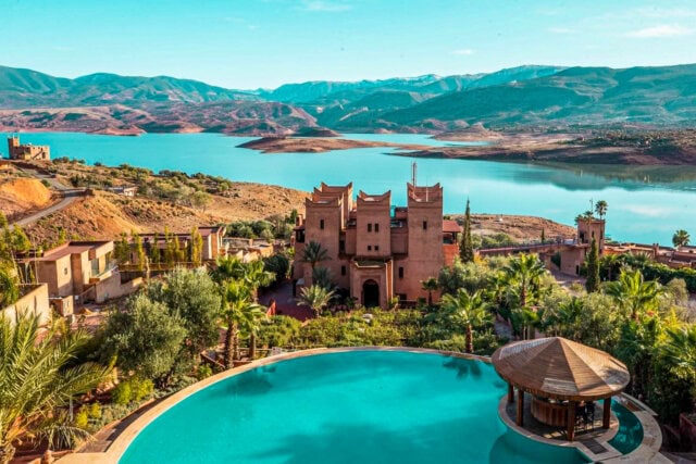 Time stands still at this charming 5-star hotel nestled in the quiet foothills of the Middle Atlas. The peaceful retreat on Lake Bin El Ouidane's shores offers spacious suites, several dining options serving seasonal Moroccan cuisine, and an outdoor infinity pool with sweeping vistas of the lake and mountains. Don't skip a visit to the spa for a Berber-style treatment before using the sauna or hammam.