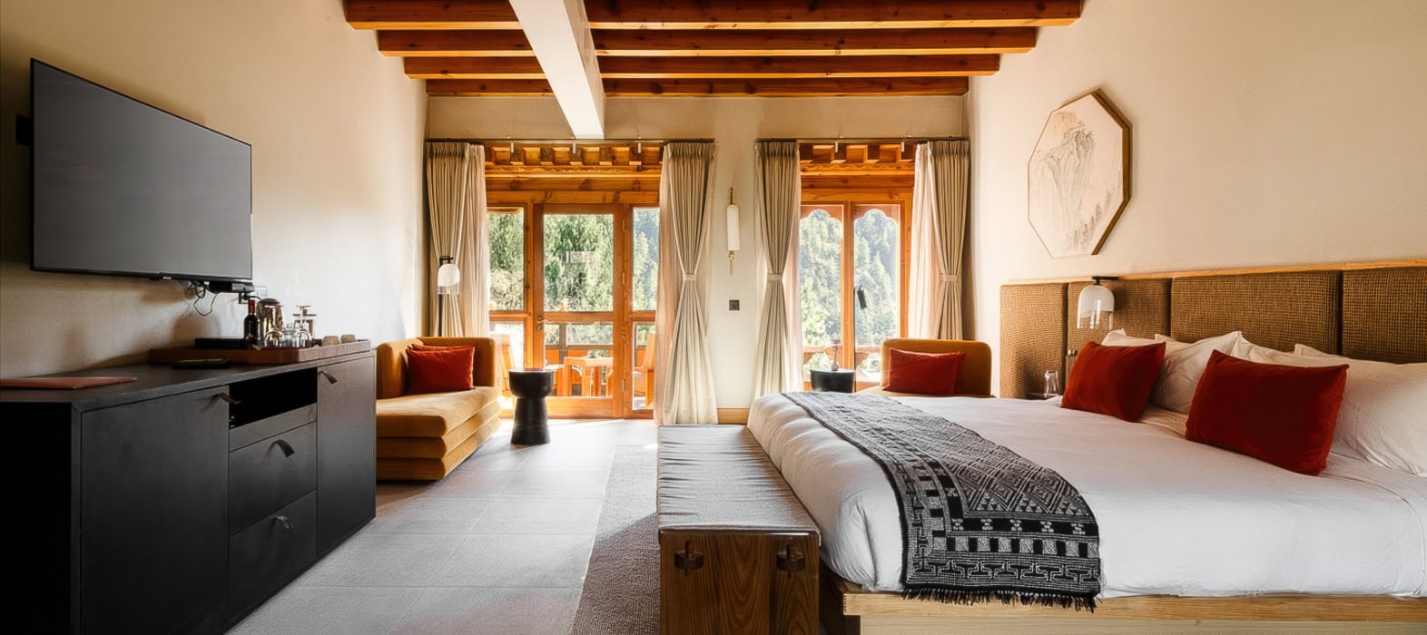 Located on 10 serene acres in the green Paro Valley, the Zhiwaling is a wonderful example of traditional Bhutanese architecture, every bit of it hand-carved n by local craftsmen. The large, airy guest rooms have balconies opening onto views of world-famous Taktsang Monastery. Enjoy the sauna or a Bhutanese-style massage at the spa, while the tea room offers local safflower and cinnamon herb teas. The hotel has two restaurants, plus the Mad Monk bar, and has appeared on Conde Nast Traveler’s annual “Gold List.”
