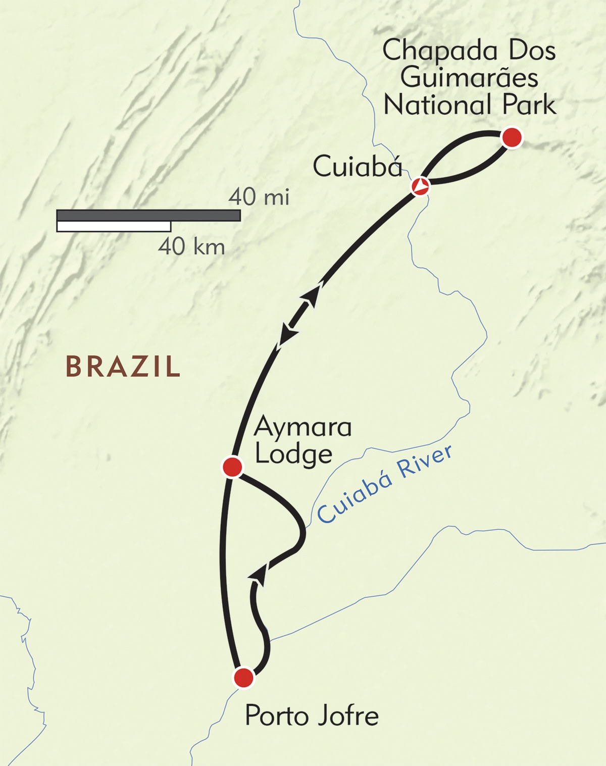 Hiking in Chapada dos Guimarães Red-rock formations and tumbling waterfalls are protected in wild Chapada dos Guimarães National Park. On our daily hikes, we explore the tablelands and tropical savanna and look for birds, including channel-billed toucans and blue-winged and red-and-green macaws. Our ecolodge is set on 1,200 acres of private land. Depart on Day 10 via Cuiabá.