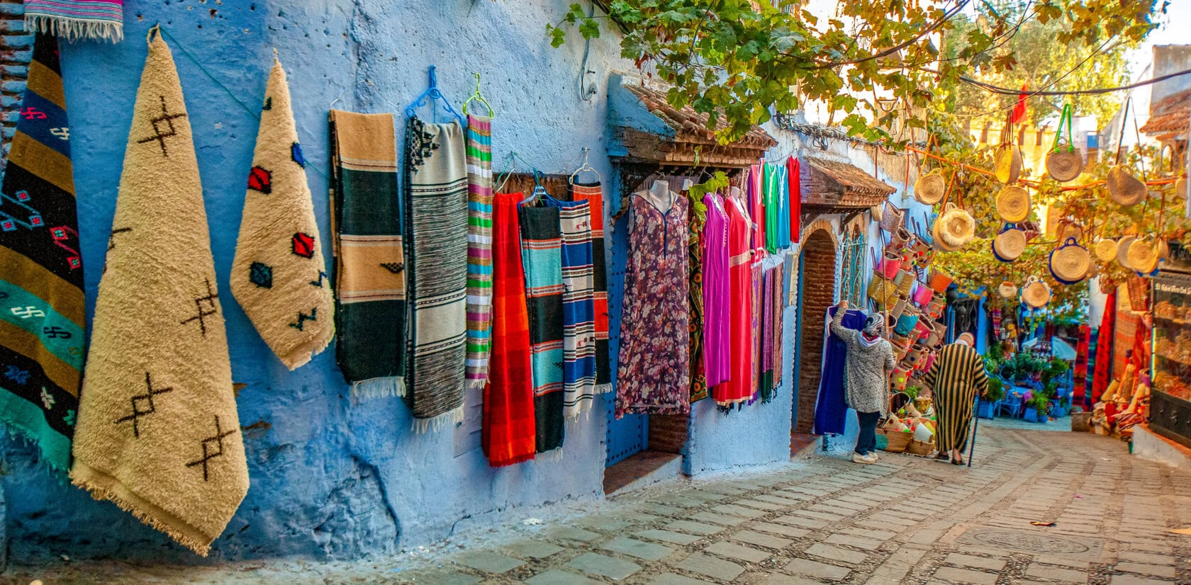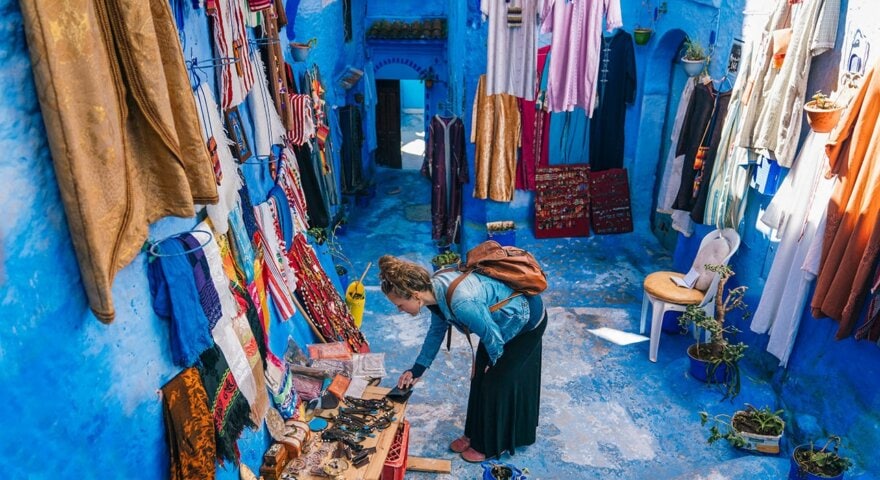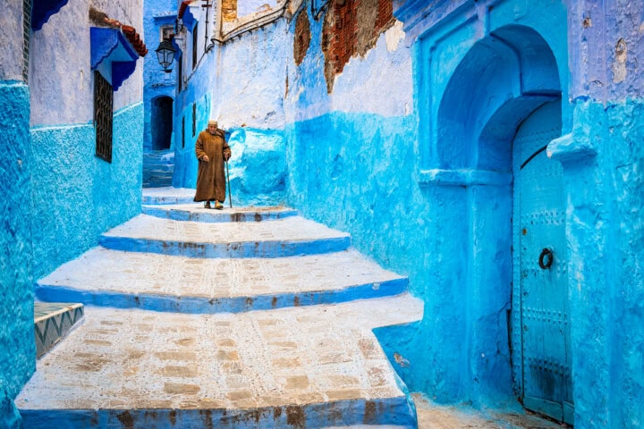 Explore atmospheric Chefchaouen, an incredibly picturesque blue-walled city. Inside its ancient gated medina, nearly every building is whitewashed or painted some shade of azure, contrasting with the terracotta rooftops and red-walled casbah. Leather and textile workshops line the city's twisting cobblestone streets, and the souks are filled with colorful wares. The Berbers who live in the surrounding villages are also known for their ironwork and textiles.