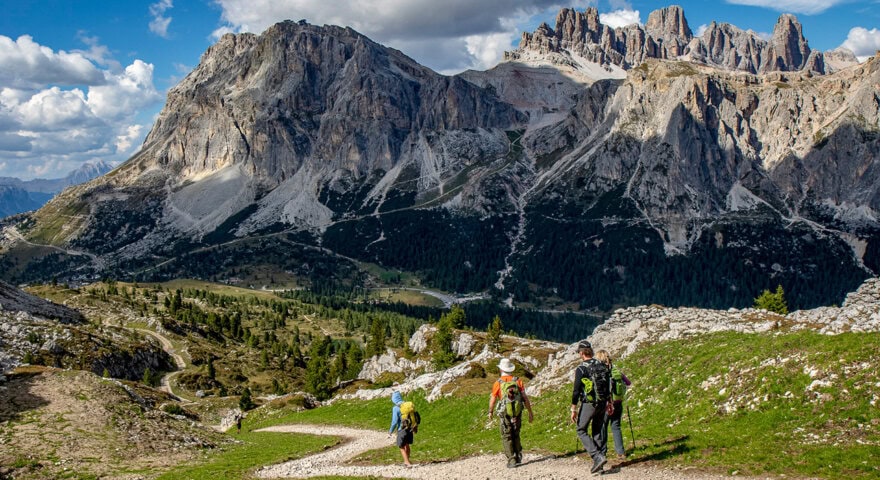 Starting right from our boutique hotel at the foot of the Dolomites, we hike through a magnificent fir forest, up across the lunar-like Val de Formin, and over the Abrizolla Pass to Rifugio Palmieri (6,740'), set on Lago Federa, where we’ll find reflections of the imposing Croda da Lago peaks. This area offers a great range of hikes, and we have options (weather depending) to hike to the majestic Pelmo, often referred to as the “Doge’s Cap” by patriotic Venetians, or the Civetta, a massif shaped like an enormous trident. Its famous north face, “the wall of walls,” was first scaled by British mountaineer Francis Fox Tuckett in 1867.
