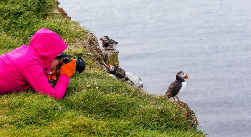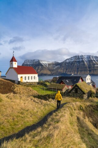 On Vágar, we hike the stupendous cliffs at Trælanípa for a view of Sørvágsvatn, a clifftop lake that seems suspended in the sky. A spectacular ferry ride below Faroese rock formations brings us to Mykines Island, stretching out in a spine of sheer cliff faces. We’ll walk through its turf-roofed village and hike to a puffin colony.