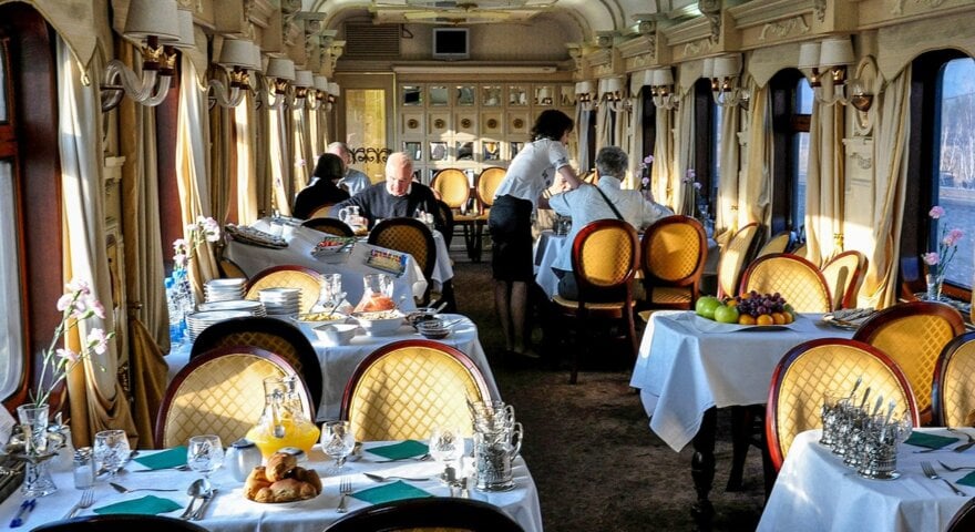 Meals at lunch and dinner are complemented by an excellent choice of wines from around the world. Meals are a relaxed affair as the restaurant cars can accommodate all our guests in a single sitting. Throughout the journey there is an informal dress code, and with the open-seating policy you can dine wherever, and with whomever, you please.