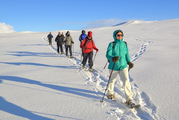No previous experience is required for snowshoeing; it is just like hiking. Snowshoes will be provided, and they strap right onto your hiking boots. Our snowshoe-hikes can be strenuous as we will be traveling across snowfields with varying conditions, from soft powder to snow with a light crust of ice. If there is no snow, we will be hiking on varied terrain, from packed dirt to lava fields. Hiking poles are provided. There is no extreme elevation change in our daily outings, but we will be ascending up to ridges — and descending back down! The conditions will dictate our exact route each day, as we choose the best route for views and an experience of the Icelandic landscape.