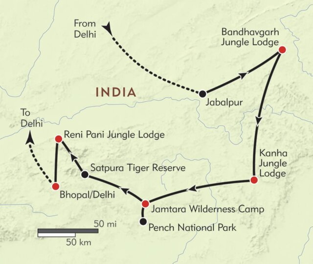 This one-of-a-kind safari visits four of India’s Project Tiger reserves, where we’ll search not only for tiger but also for leopard, sloth bear, dhole (Indian wild dog), and endemic barasingha deer. We begin in Bandhavgarh, a small park with a thriving tiger population, then head to renowned Kanha, part of Project Tiger since 1973. Moving to the lush “Kipling country” of Pench National Park, we might, with luck, catch a glimpse of the park’s leopards and jungle cats, and we finish our safari at Reni Pani, a luxury property at Satpura National Park, to enjoy village and school visits along with canoe safaris. As we travel, we’ll be warmly welcomed by our local hosts and the communities they are connected to.