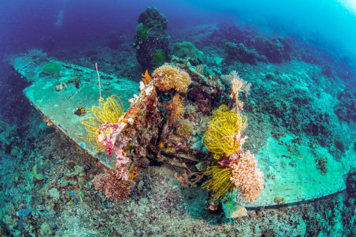 We begin the day snorkelling above a Japanese Zero fighter plane resting in just 30 feet of water—a WWII relic that's now home to colorful fish. Hawksbill and green turtles, barracuda, and surgeonfish (think of Dory, from Finding Nemo) all live in the area. In the afternoon we snorkel in a new spot, with sea fans, blue sea stars, huge barrel sponges, an amazing array of hard and soft corals, and bright sea whips on reef “islands” above a white sand bottom.