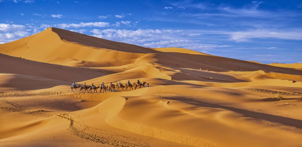 Crossing the cedar forests of the Middle Atlas, we descend into the stunning canyon of the Ziz Gorge and head to our luxurious private Sahara camp, with its spacious walk-in tents, white-tablecloth service, colorful Moroccan carpets, and cozy beds. Secluded from the noise and crowds of other camps, it is an exclusive hideaway from which we explore the desert by camel, 4WD vehicle, and on foot before relaxing with sundowners on the dunes.