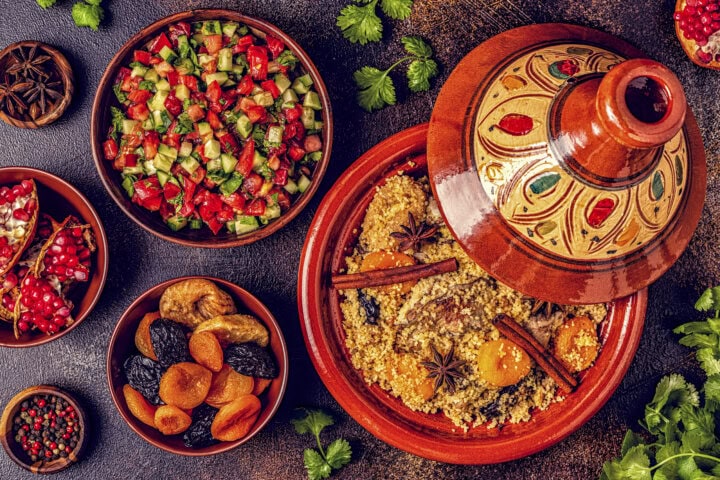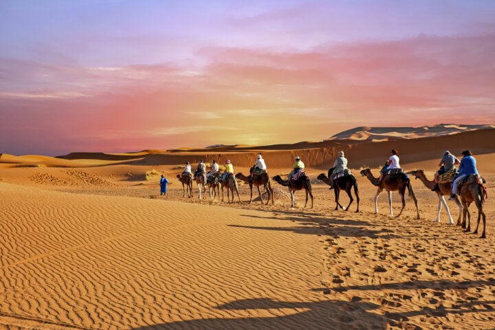 We enjoy first-class hotels and high-end riads in the cities and smaller, quainter lodges in the more remote areas. We spend two nights at a private Sahara desert camp while on the camel trek, where we provide all the comforts you would want in a luxury tented camp. Canvas interiors are carpeted with Moroccan rugs. Comfortable beds are covered by cozy duvets. You’ll have a washstand, shower, and toilet within your tent, separated from the sleeping room by traditional white curtains. Meals are served in a large dining tent with a comfortable lounging area outside.