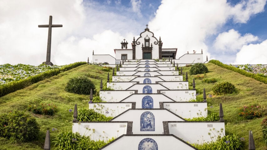 On São Miguel Island, we hike up to the twin crater lakes of Sete Cidades, then fly to Faial Island for a hike on the Praia do Norte Levada with spectacular coastal views.