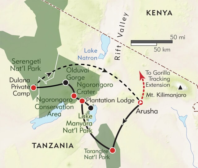 We enter the Serengeti, which means “endless plains” in Maasai. From December through June, our safari stops at Olduvai Gorge—where Mary Leakey made her famous early hominid discoveries, then continues to our secluded private camp surrounded by the wild Serengeti. In this idyllic setting, we have fabulous access to the migrating herds as we explore in custom-designed Land Cruisers, watching for wildebeests and zebras as well as giraffes, hippos, crocodiles, large prides of lion, cheetah, and clans of spotted hyena. Depart on Day 13 via Arusha.