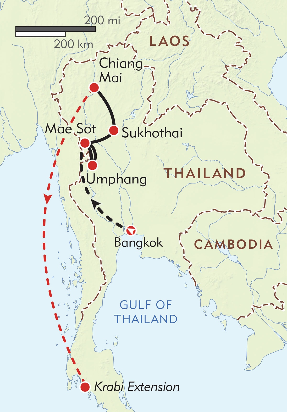 You’ll travel on a variety of modes of transport on your journey, including a private minivan, a songthaew (traditional Thai taxi), and tuk-tuks. On Days 4, 6, 7, and 8, there are drives of 3-4 hours on curving mountain roads. There is an internal flight from Bangkok to Mae Sot on Day 3.