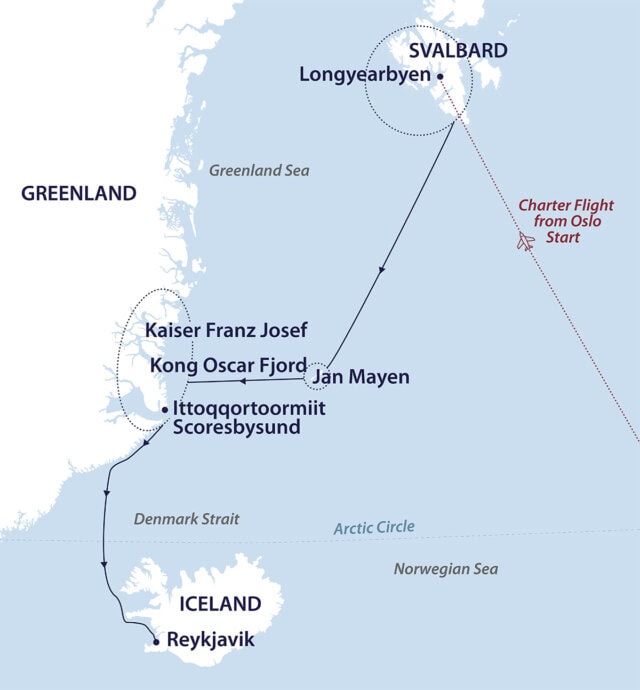 Aboard an expedition cruise vessel, explore Svalbard, a world of near-endless daylight, where polar bear sightings quicken your pulse, walrus haul out on sea ice, and guillemot cries echo from towering cliffs. In East Greenland, sail deep into the world's largest fjord, Scoresbysund, visit Ittoqqortoormiit, one of the world's remotest Inuit settlements, cruise among iridescent icebergs sculpted into fantastic shapes, and walk across tundra blooming in brightly colored flowers, while tasting delicious wild berries. Your voyage ends in Reykjavik, capital of Iceland.